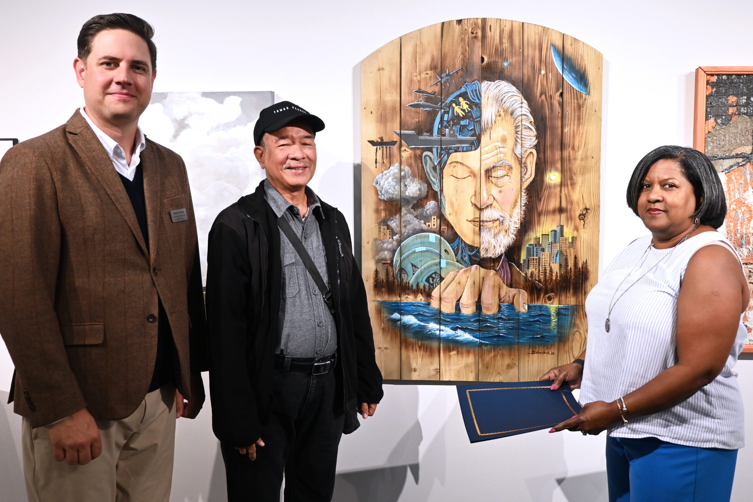 Seniors Art Competition, August 2024. Adam De Caire (Senior Director, Public Affairs & The Sienna For Seniors Foundation at Sienna Senior Living), Augusto Dimalanta (artist), and Enez Perkins (Oshawa Senior Community Centres).