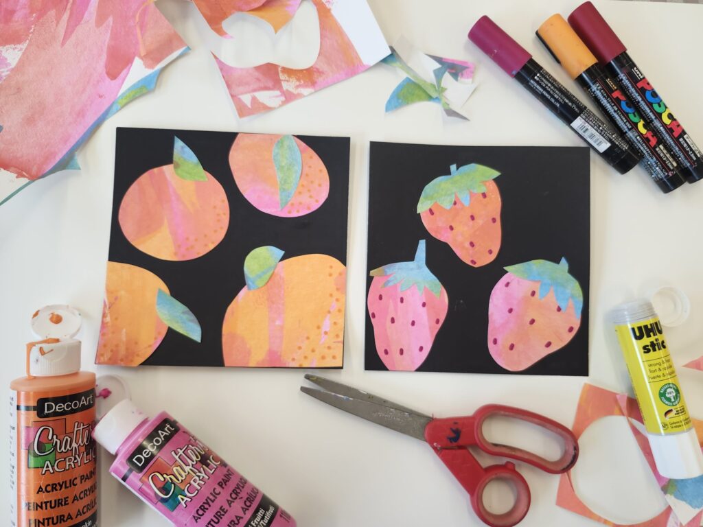 In the studio create your own abstract patterned papers with acrylic paint. We will then cut our papers into the shapes of plants, gluing together colourful collages that pop against a simple background.