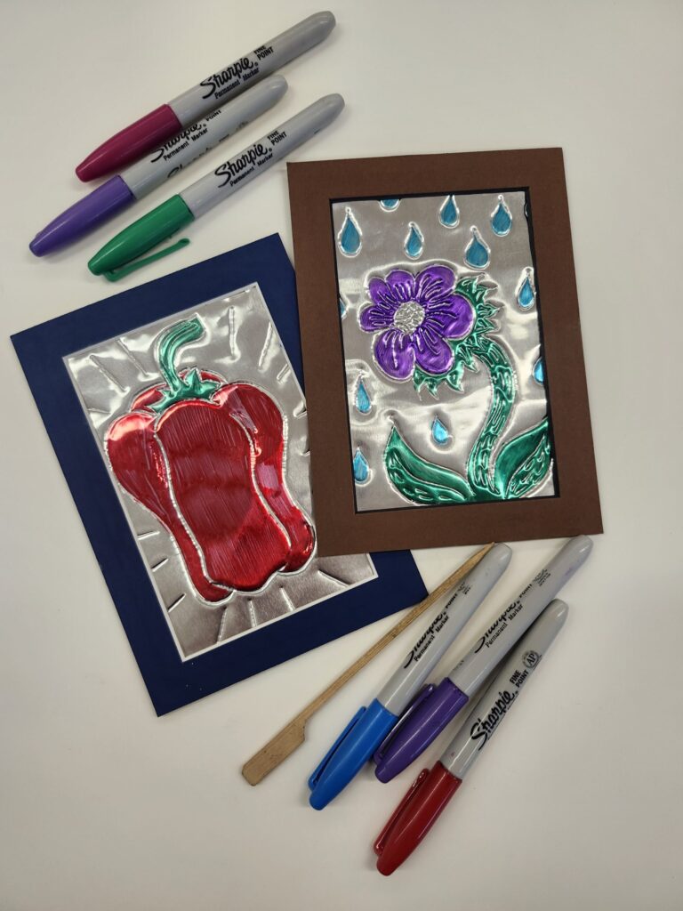 In the lobby we are creating linework drawings in METAL. We will etch the shapes of leaves, flowers, veggies or fruits in the shiny aluminum. Then use sharpie markers to colour them in, leaving them with a reflective shimmer.
