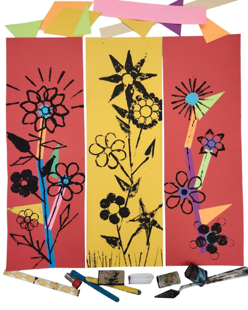In the studio, use a variety of found-objects and materials to stamp in flower shapes. We are getting messy with ink, making our artworks stand out against a colourful collaged background.